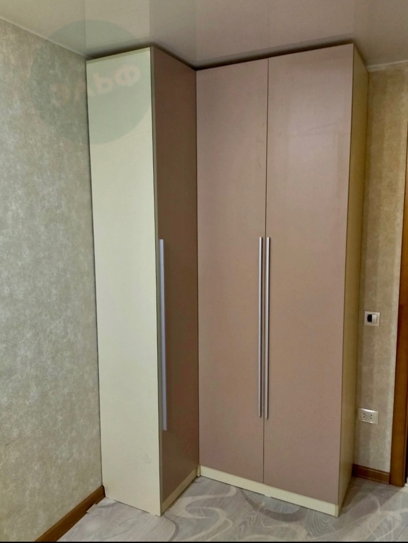 Угловой шкаф в приятных, кофейных тонах.